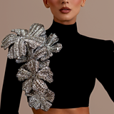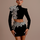 Black short dress with silver embellishments Asymmetrical design with a high neckline Long sleeves with intricate silver embellishments on the right shoulder Crop top style revealing midriff Mini skirt adorned with matching silver embellishments around the waist Form-fitting silhouette Embellishments create a floral...- $914.25