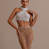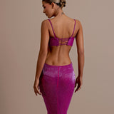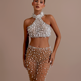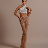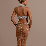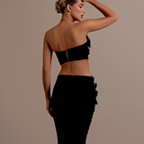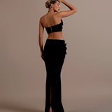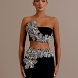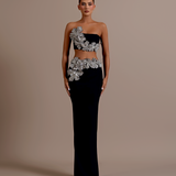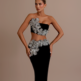 Strapless design with a unique crop top and high-waisted skirt. Embellished with intricate silver floral appliqués High-waisted, floor-length skirt with matching silver floral embellishments on the left hip Straight fitted Crop top and skirt secured with a zipper in the middle. Model is...- $1,033.50
