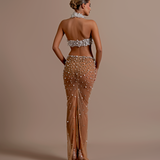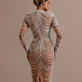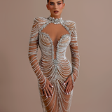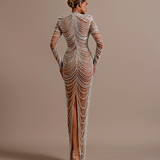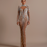Long embellished gown High neckline with a keyhole cutout at the front Deep V-Cut Long sleeves, fully adorned with beadwork Fitted bodice with structured cups enhancing the bust Beadwork forms draped, chain-like patterns that flow from the bust to the hem Model is...- $1,828.50