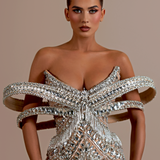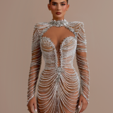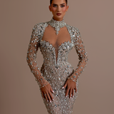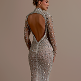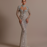 High neckline with intricate silver detailing Deep keyhole cutout at the front Long sleeves, fully covered with silver embellishments Fitted Waist Form-fitting silhouette that flares slightly at the hem Floor-length gown with a slight train Model is wearing a size S- $1,669.50