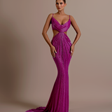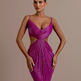Long Fitted Gown Sweetheart neckline with a twisted, ruched fabric detail Cutouts on the sides of the waist Vertical lines of sequins elongate the figure Structured bodice The zipper runs from the mid-back down to the hips Model is wearing a size S...- $2,279.00