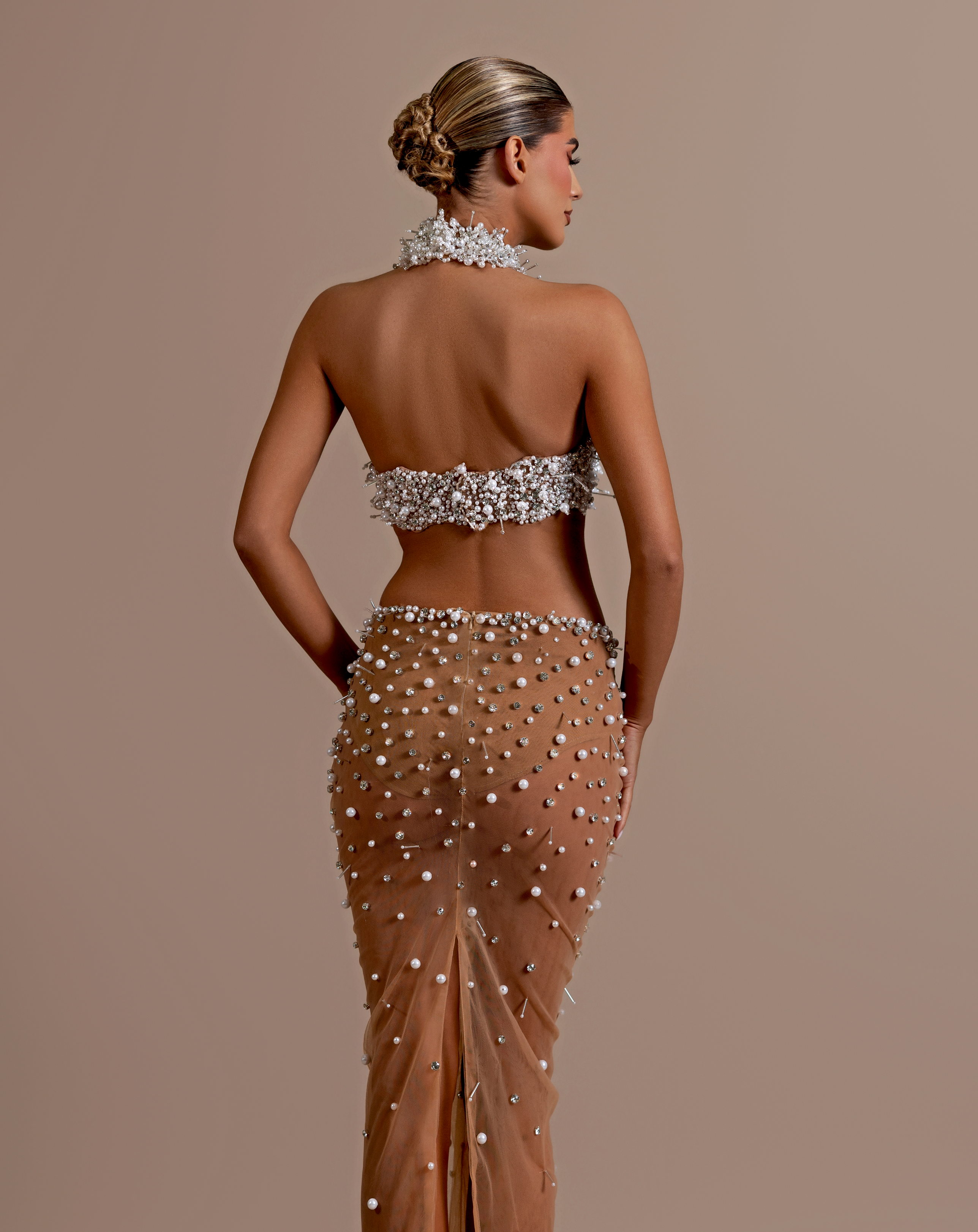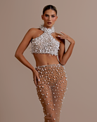High-waisted sheer skirt adorned with scattered white pearls and beads