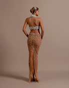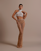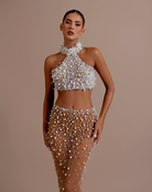 Halter neck crop top with dense white beadwork, providing full coverage on the bust