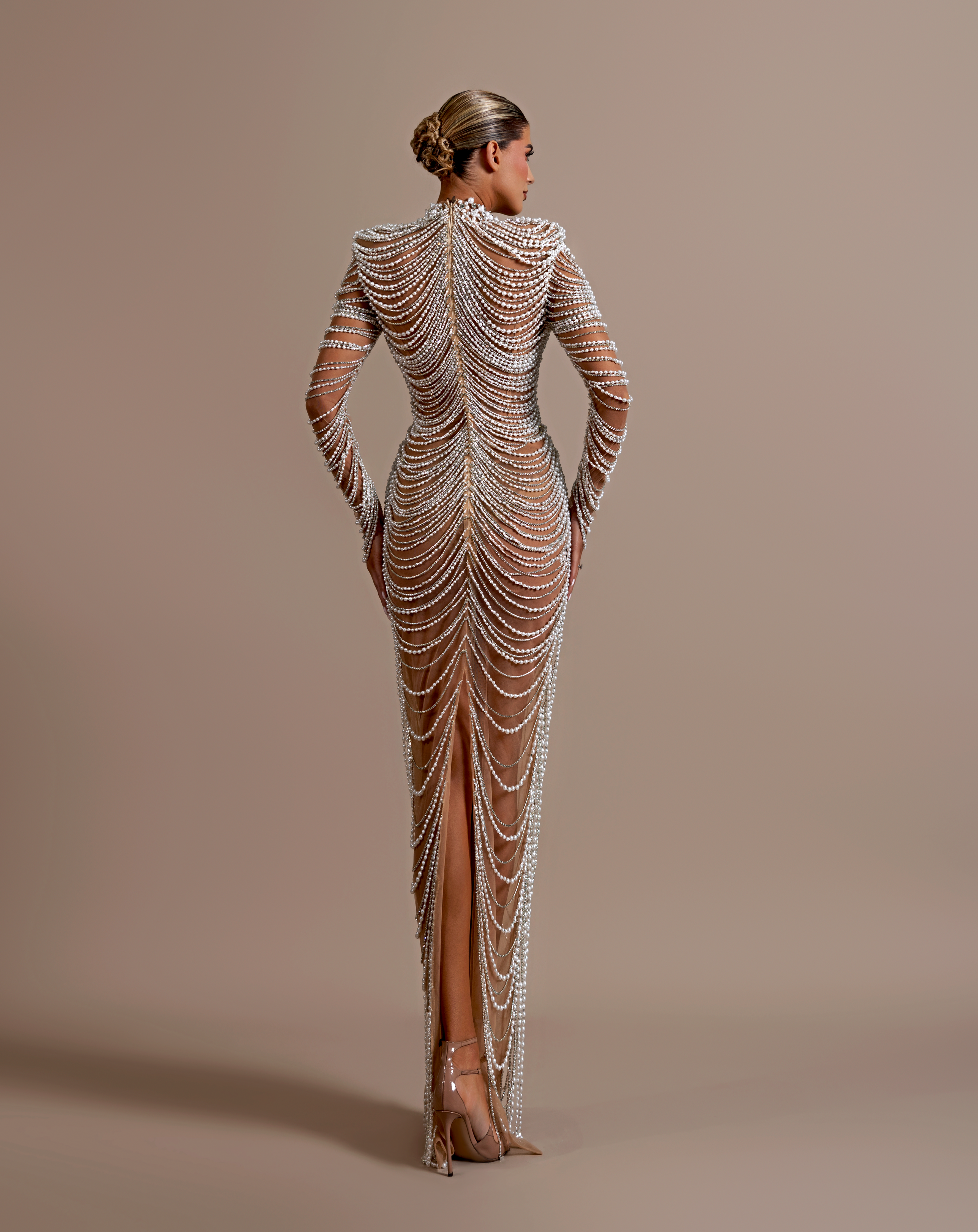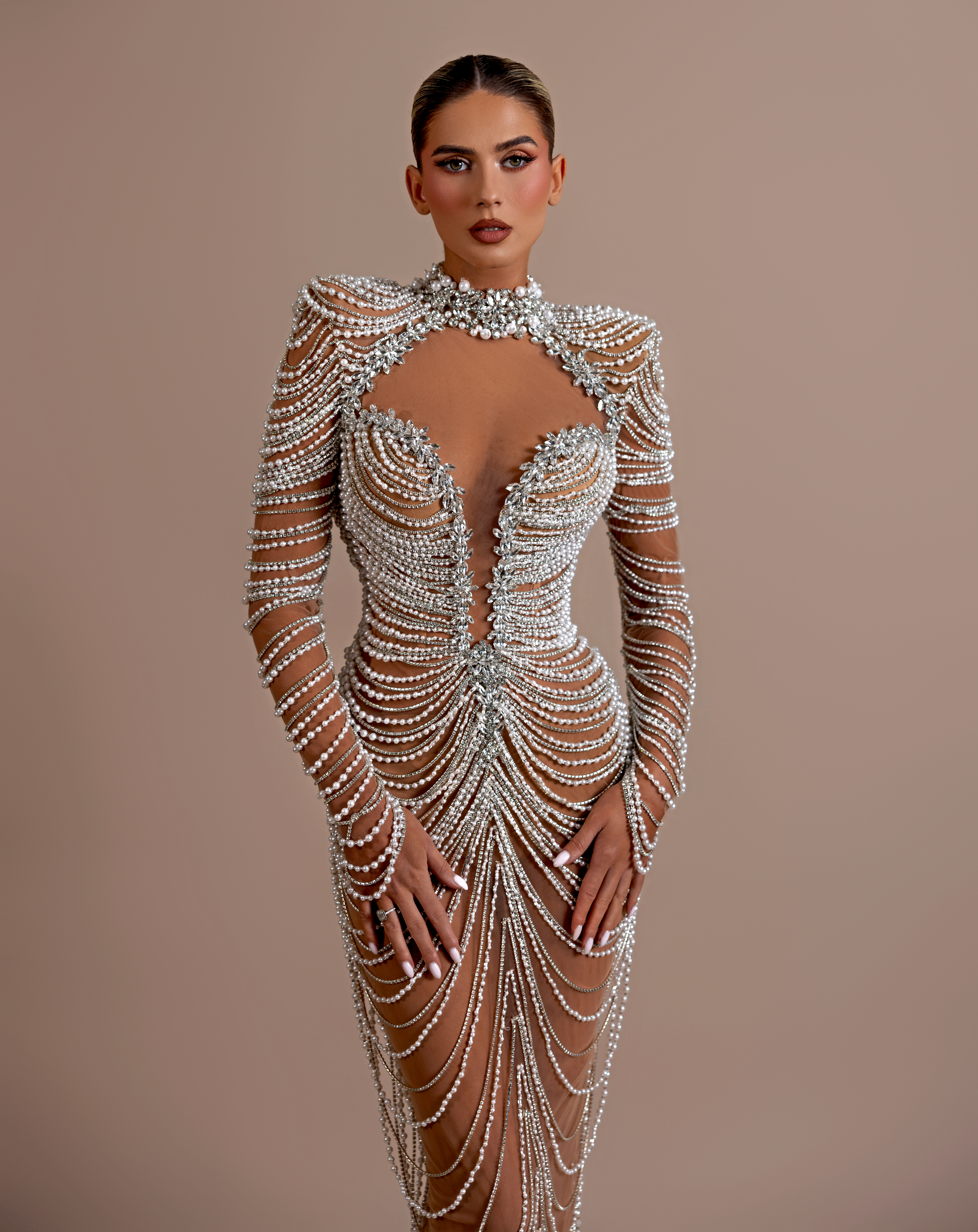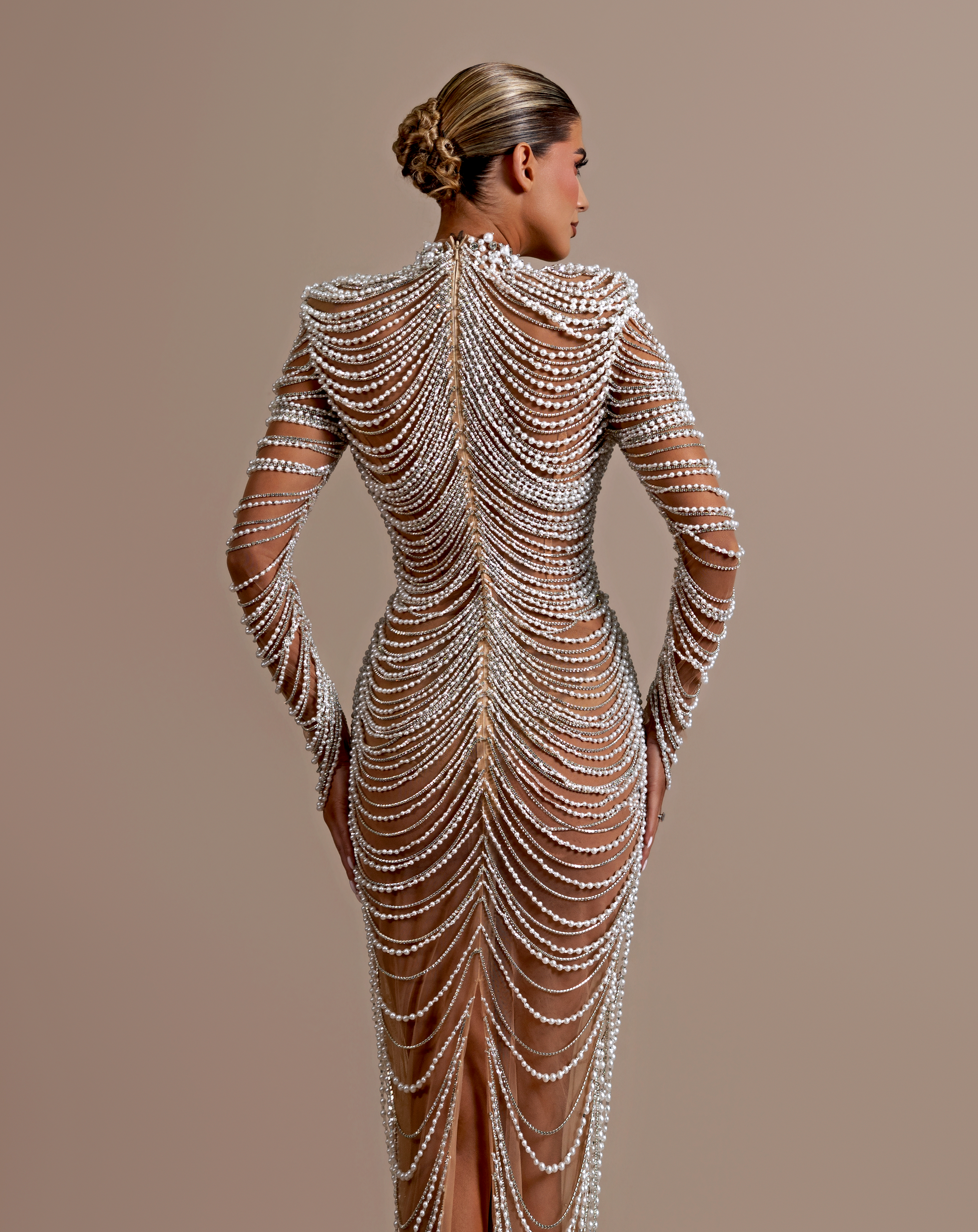 Long sleeves, fully adorned with beadwork