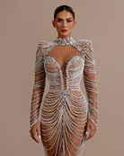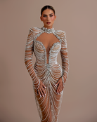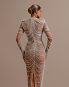 Beadwork forms draped, chain-like patterns that flow from the bust to the hem
