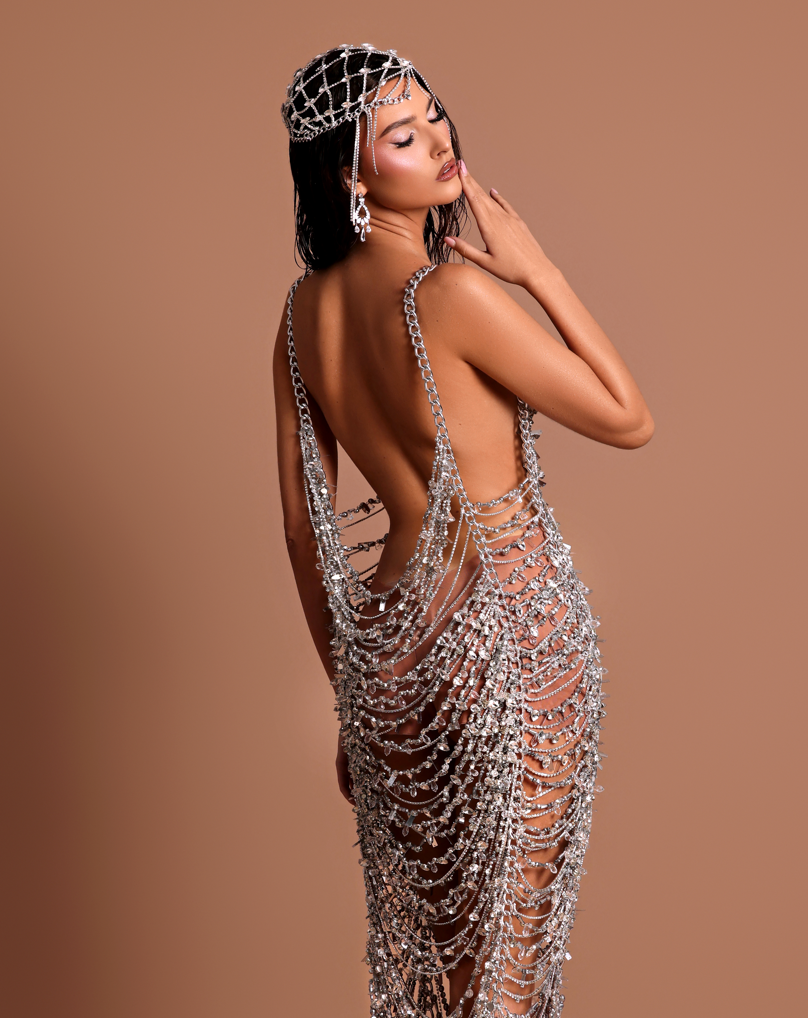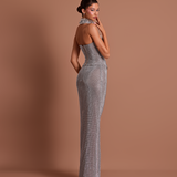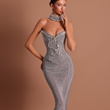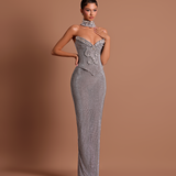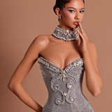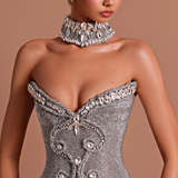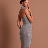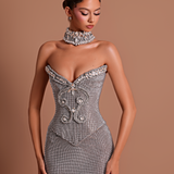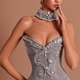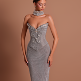 Sculpted silver gown with intricate hand embellished crystal beadwork Structured sweetheart neckline with dramatic crystal detailing Boned corset bodice Baroque inspired crystal motifs Detachable crystal choker Full-length Form-fitting silhouette Handcrafted luxury piece Model is wearing a size S- $1,929.20