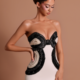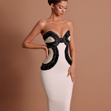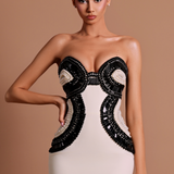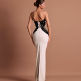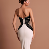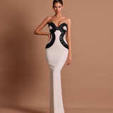 Strapless ivory mermaid gown with contrasting black beadwork Sculpted bodice with intricate crystal detailing Contoured side panels for a dramatic hourglass silhouette Back zipper closure Fully lined for comfort and a smooth finish High slit back for ease of movement Handcrafted luxury piece...- $1,505.20