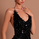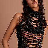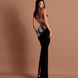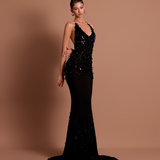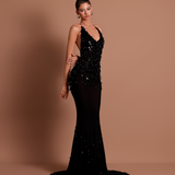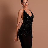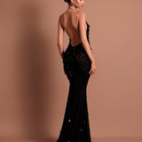 Deep black mermaid gown with dramatic hand-embellished sequin detailing Sleeveless design with a plunging neckline Form-fitting silhouette that flares into a dramatic, floor-length train Fully open back 3D sequin embellishments Handcrafted luxury piece Model is wearing a size S- $1,219.00