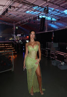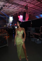 - Floor-length skirt with a high slit on one leg