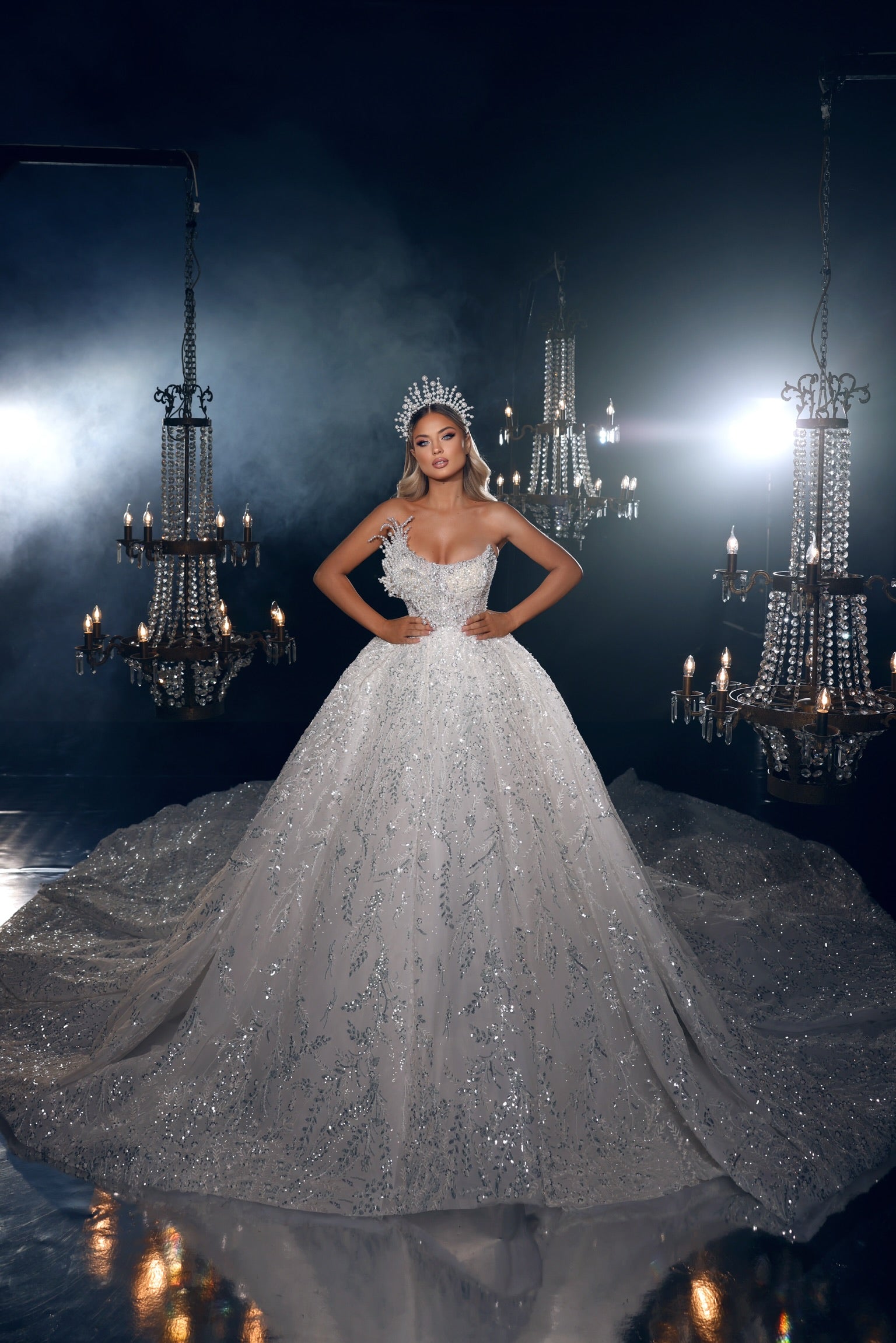 This wedding dress is the epitome of luxury and elegance. The corset-style bodice exudes sophistication, while the right side is adorned with shimmering pearls and intricate accessories, creating a stunning and unique effect. The lower part of the dress is wide and flowing, with a long and dramatic train that measures 2.5 meters in length. The luxurious material drapes gracefully, creating a beautiful silhouette that will make you feel like a true princess. Perfect for a grand ceremony, this wedding dress is a showstopper that is sure to leave a lasting impression on your special day.