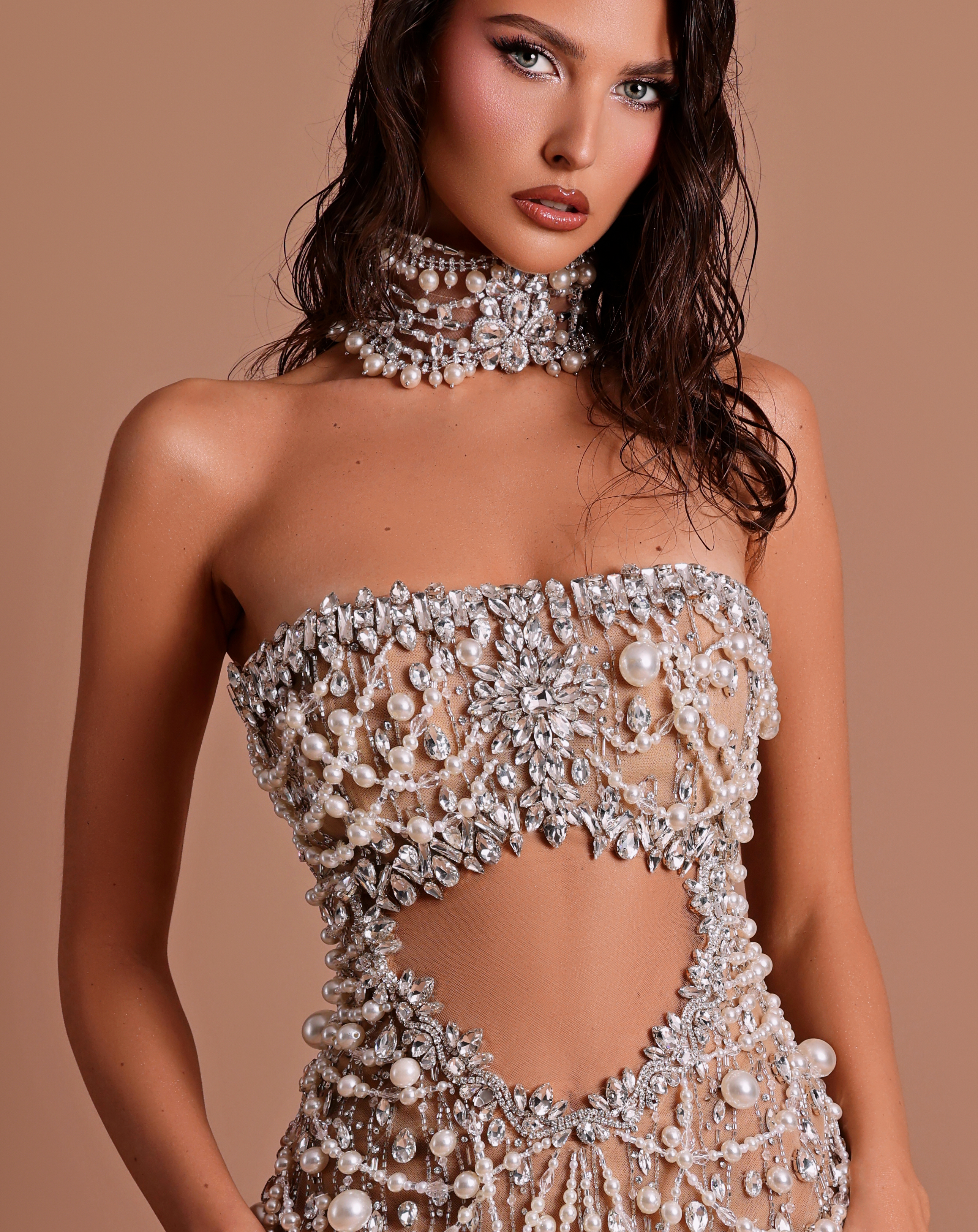 • Hand embellished with cascading crystal beads and intricate pearl work