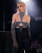 "Crystal Venom" is a fierce and edgy crop top set featuring a black rubber top adorned with sparkling crystals and stones. The long sleeves and gloves add a touch of elegance, while the pants with slits and rubber material add a daring edge to the overall look.