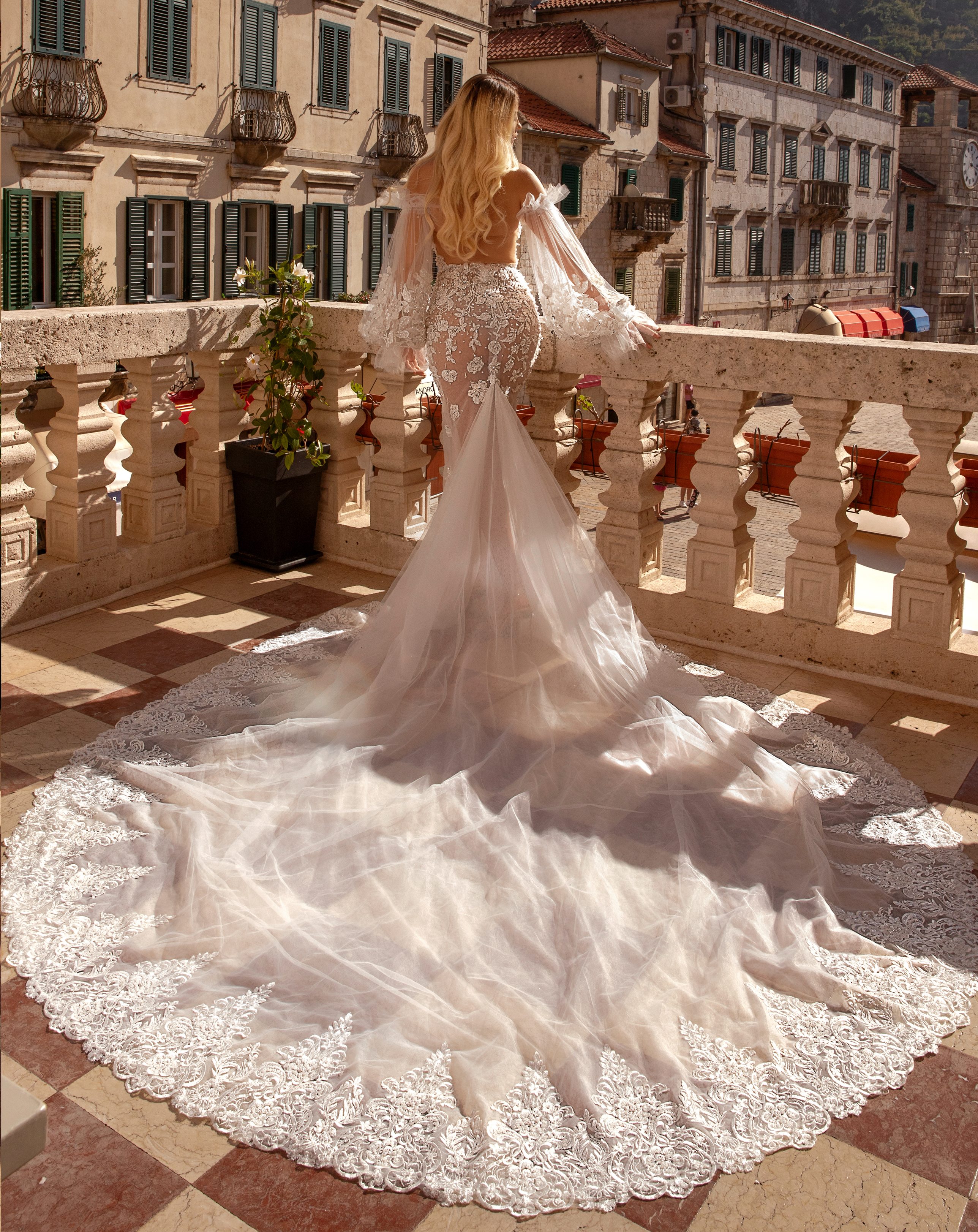 This dress gown is a masterpiece of elegance and beauty. The heart-shaped corset top accentuates your curves, while the puffed sleeves attached to the corset add a touch of femininity and romance to the overall design. The lower part of the dress is designed in the shape of a mermaid, creating a graceful and sophisticated silhouette. The dress is adorned with 3D flowers, pearls, stones, and crystals, creating a stunning visual effect that is both breathtaking and mesmerizing. The tail of the dress is 2 meters long, adding an extra layer of grandeur and majesty to your bridal ensemble. With its delicate and intricate details, this dress is perfect for any bride who wants to feel like a true princess on her wedding day.