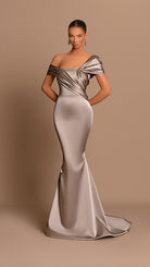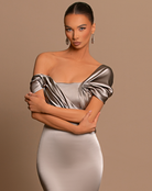 This gray satin dress is a true masterpiece of design, combining elegance, sophistication, and style in a single stunning garment. The dress features a beautiful corset that wraps around the torso, accentuating the curves of the wearer and creating a sleek and alluring silhouette. Attached to the corset are two delicate scarves that draped elegantly over the arms, adding a touch if whimsy and charm to the overall design. These scarves add a unique element of visual interest to the dress. Beneath the corset, the dress flares our into a dramatic and mesmerizing long-tailed mermaid shape. Crafted from the finest materials