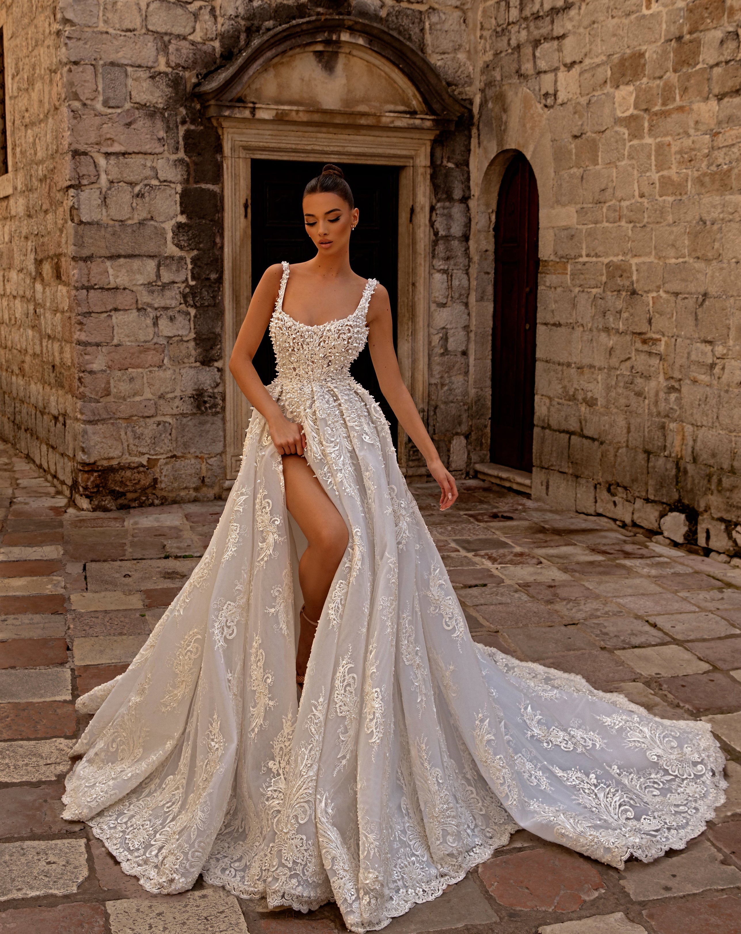 This stunning corset wedding dress features a clean and classic design with thin straps and a wide bottom that flares into an open leg, creating a dramatic silhouette. The dress is adorned with intricate beading, pearls, and crystals, adding a touch of elegance and sparkle to the overall look. The dress is finished with a gorgeous train that measures 2 meters long, adding a touch of glamour to the bride's walk down the aisle.