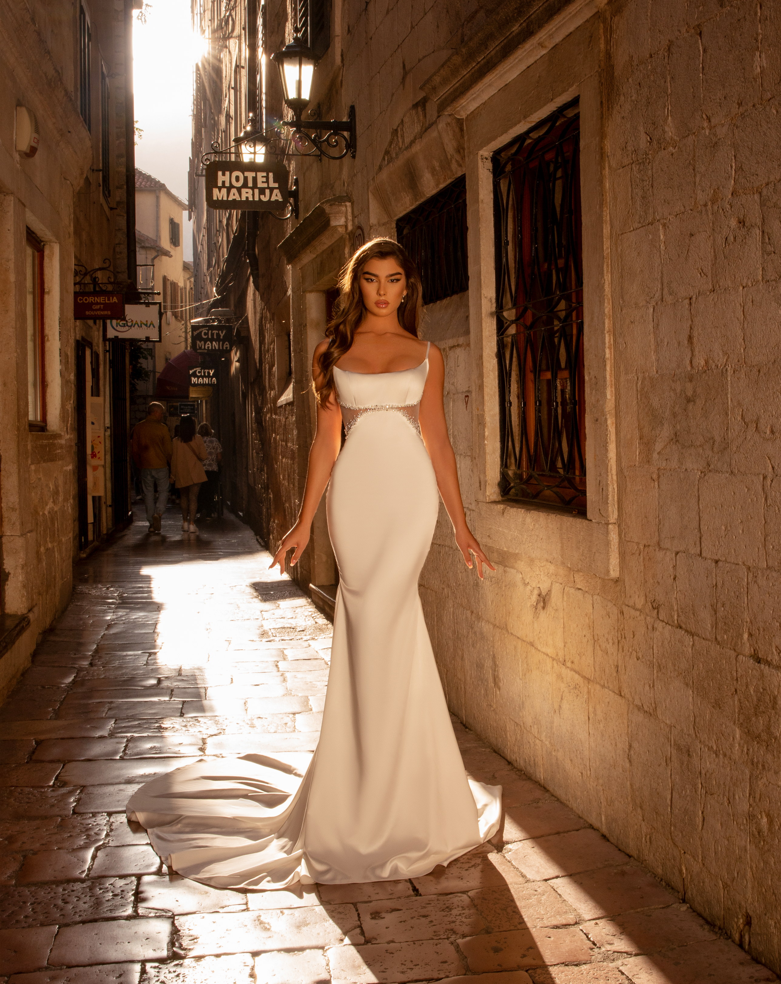 This stunning satin dress features a delicate tulle mesh detail at the waist, adorned with hand-beaded crystals, stones, and pearls for a touch of elegant shimmer. The dress boasts thin straps and a form-fitting silhouette that extends 1.5 meters in length for a truly dramatic effect. Perfect for any formal occasion where you want to make a statement, this dress is sure to turn heads.
