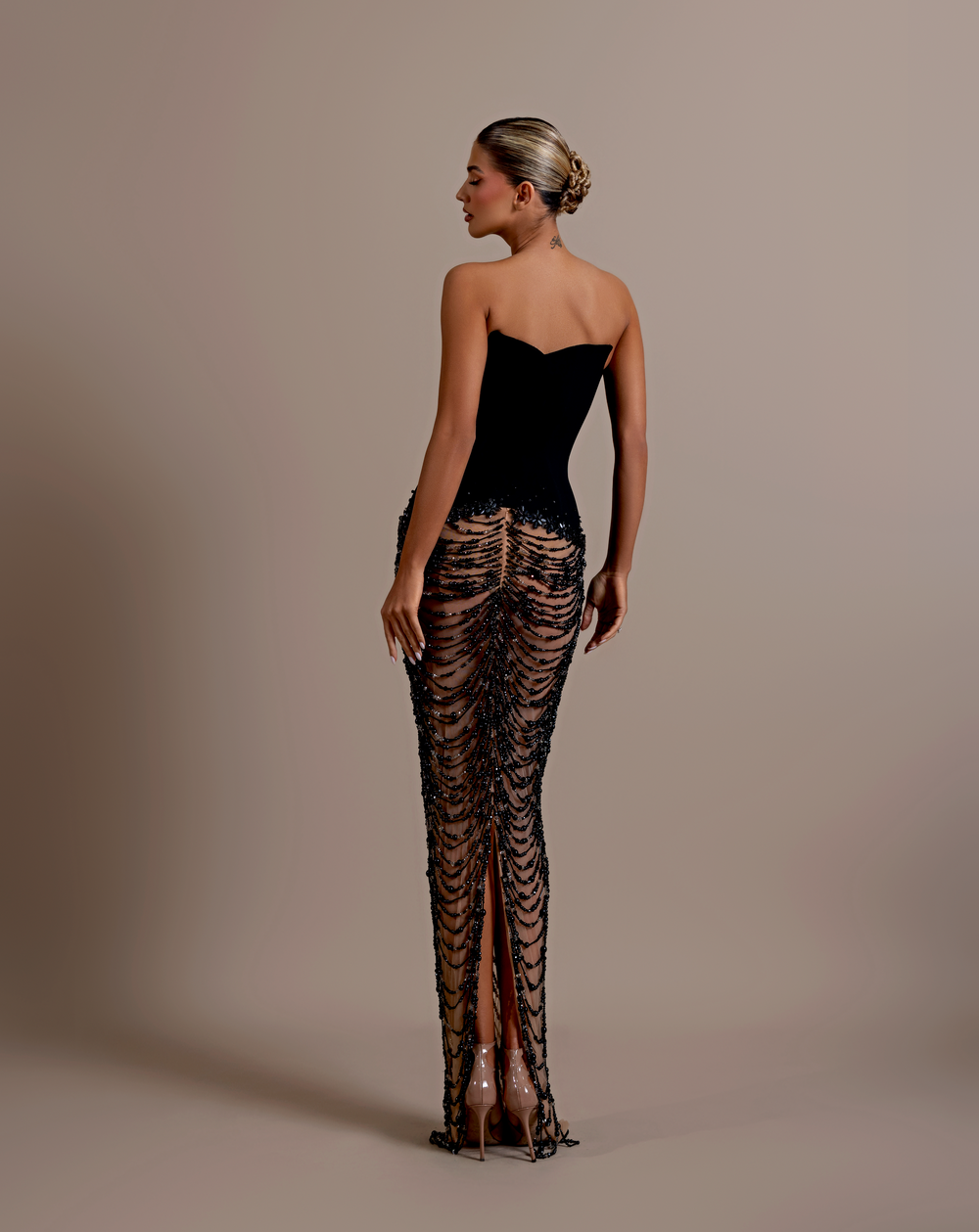Lower part adorned with intricate black beadwork and sequins over a sheer base