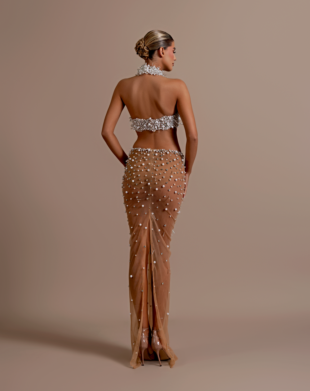 High-waisted sheer skirt adorned with scattered white pearls and beads