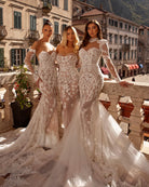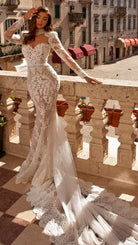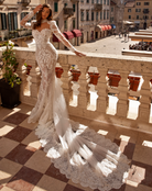 This dress gown is a true work of art, exuding a sense of timeless elegance and sophistication. The upper part of the dress features a corset with tulle and a turtle neck, creating a unique and modern twist on a classic design. The long sleeves add a touch of refinement and grace, making you look and feel like a true queen on your special day. The dress is designed in the shape of a mermaid, highlighting your curves and creating a stunning and captivating silhouette. The 2-meter-long tail adds an extra layer of grandeur and majesty, making you feel like the belle of the ball. The back part of the dress is covered with tulle, above which sits a layer of material in the form of flowers, embroidered with pearls and crystals, creating a mesmerizing and enchanting effect. With its intricate and delicate details, this dress is perfect for any bride who wants to feel like a true masterpiece on her wedding day.