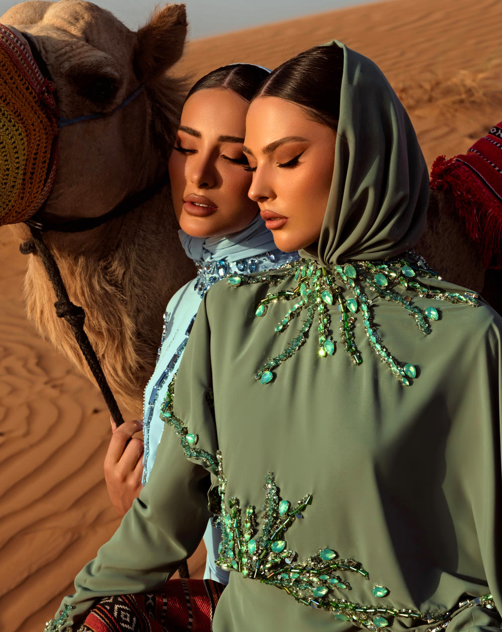 Sage Modest Gown with Hijab and Beaded Cape Accent